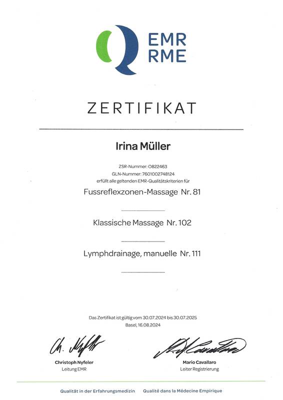 Seit mehreren Jahren beschäftige ich mich mit der Gesundheit und dem Wohlbefinden im eigenen Körper. Seit Anfang 2020 führe ich meine eigene Massagepraxis in Schmerikon SG und seit 2021 bin ich Krankenkassen Anerkannt. Meine EMR-Nummer lautet: 38863. Ausbildungen: